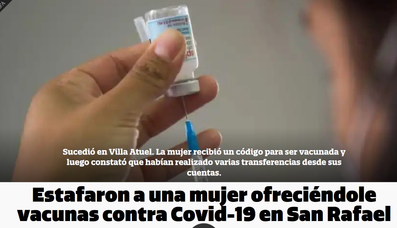 MENDOZA Estafaron a una mujer ofreciéndole vacunas contra Covid-19 en San Rafael Posted on diciembre 17, 2024 por coronado https://www.mendozapost.com/policiales/estafa-a-mujer-en-villa-atuel-le-ofrecieron-vacunas-covid/
