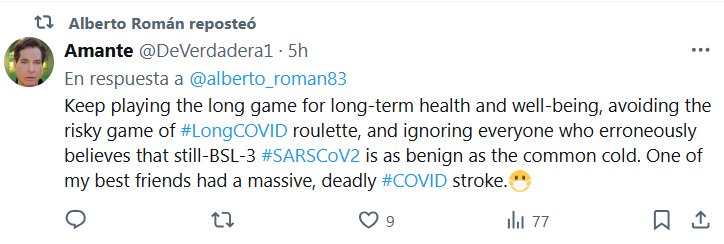TESTIMONIOS (EN INGLÉS) Sigan jugando a largo plazo para lograr una salud y un bienestar duraderos, evitando el arriesgado juego de la ruleta del #COVIDProlongado e ignorando a todos los que creen erróneamente que el #SARSCoV2, que todavía tiene un nivel de seguridad BSL-3, es tan benigno como un resfriado común. Uno de mis mejores amigos sufrió un derrame cerebral masivo y mortal por #COVID.😷
