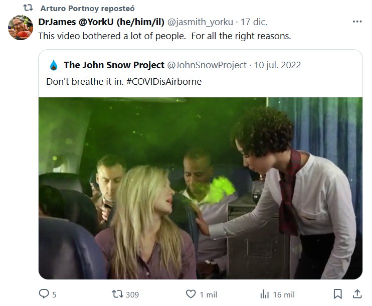 EN INGLÉS Dr James @YorkU (él/él/il) @jasmith_yorku Este video molestó a mucha gente. Por todas las razones correctas. Cita The John Snow Project @JohnSnowProject · 10 jul. 2022 No lo inhales. #COVIDisAirborne