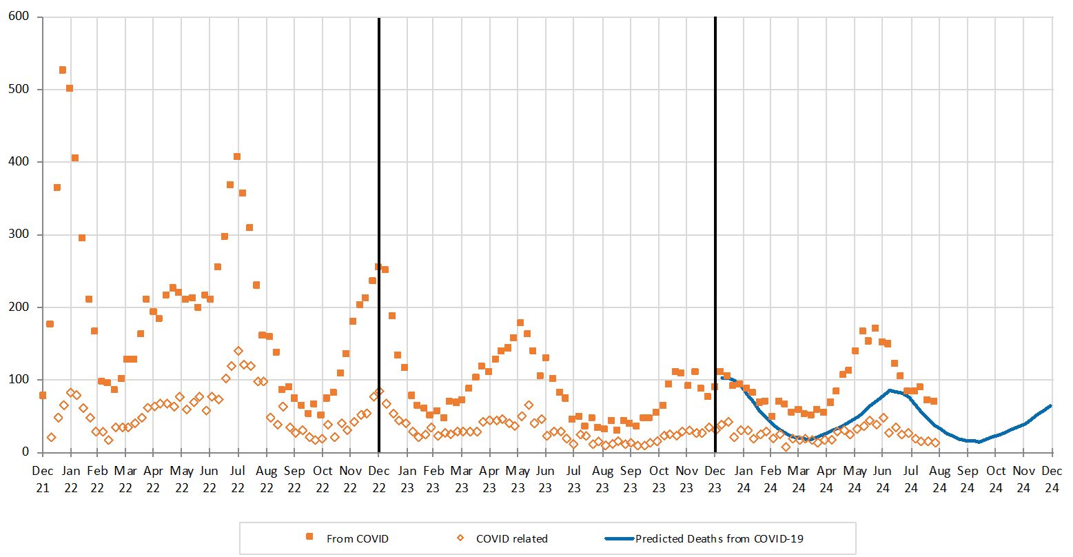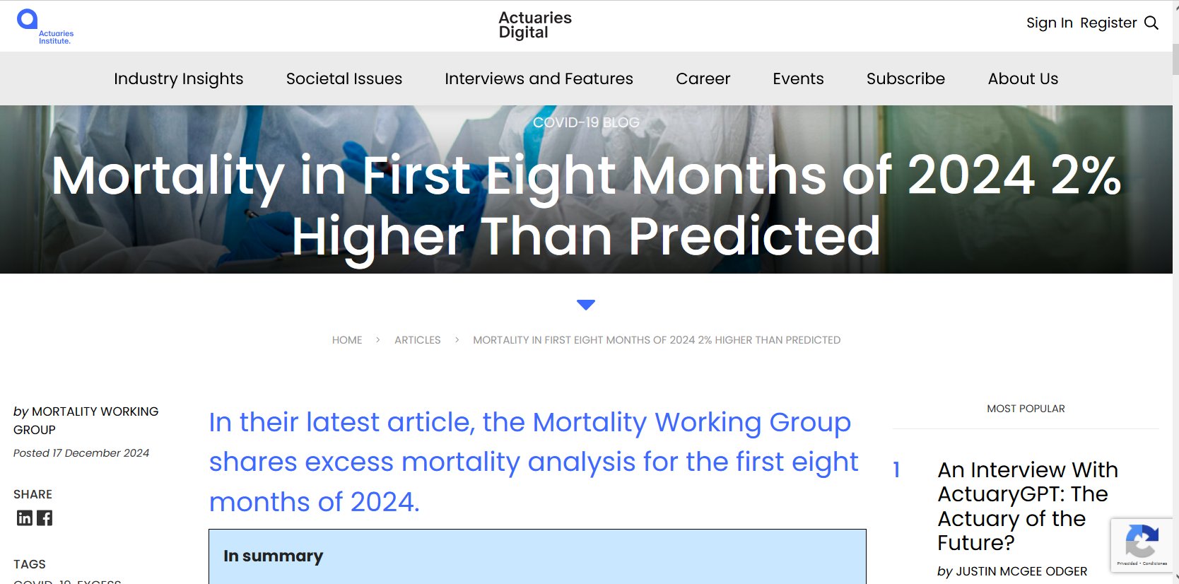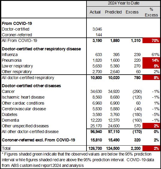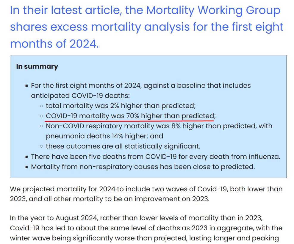 En su último artículo, el Grupo de Trabajo sobre Mortalidad comparte un análisis del exceso de mortalidad durante los primeros ocho meses de 2024. En resumen Durante los primeros ocho meses de 2024, en comparación con una línea de base que incluye las muertes anticipadas por COVID-19: la mortalidad total fue un 2 % más alta que lo previsto; la mortalidad por COVID-19 fue un 70 % más alta que lo previsto; la mortalidad respiratoria no relacionada con COVID fue un 8 % más alta que lo previsto, y las muertes por neumonía un 14 % más altas; y todos estos resultados son estadísticamente significativos. Ha habido cinco muertes por COVID-19 por cada muerte por influenza. La mortalidad por causas no respiratorias ha estado cerca de lo previsto.