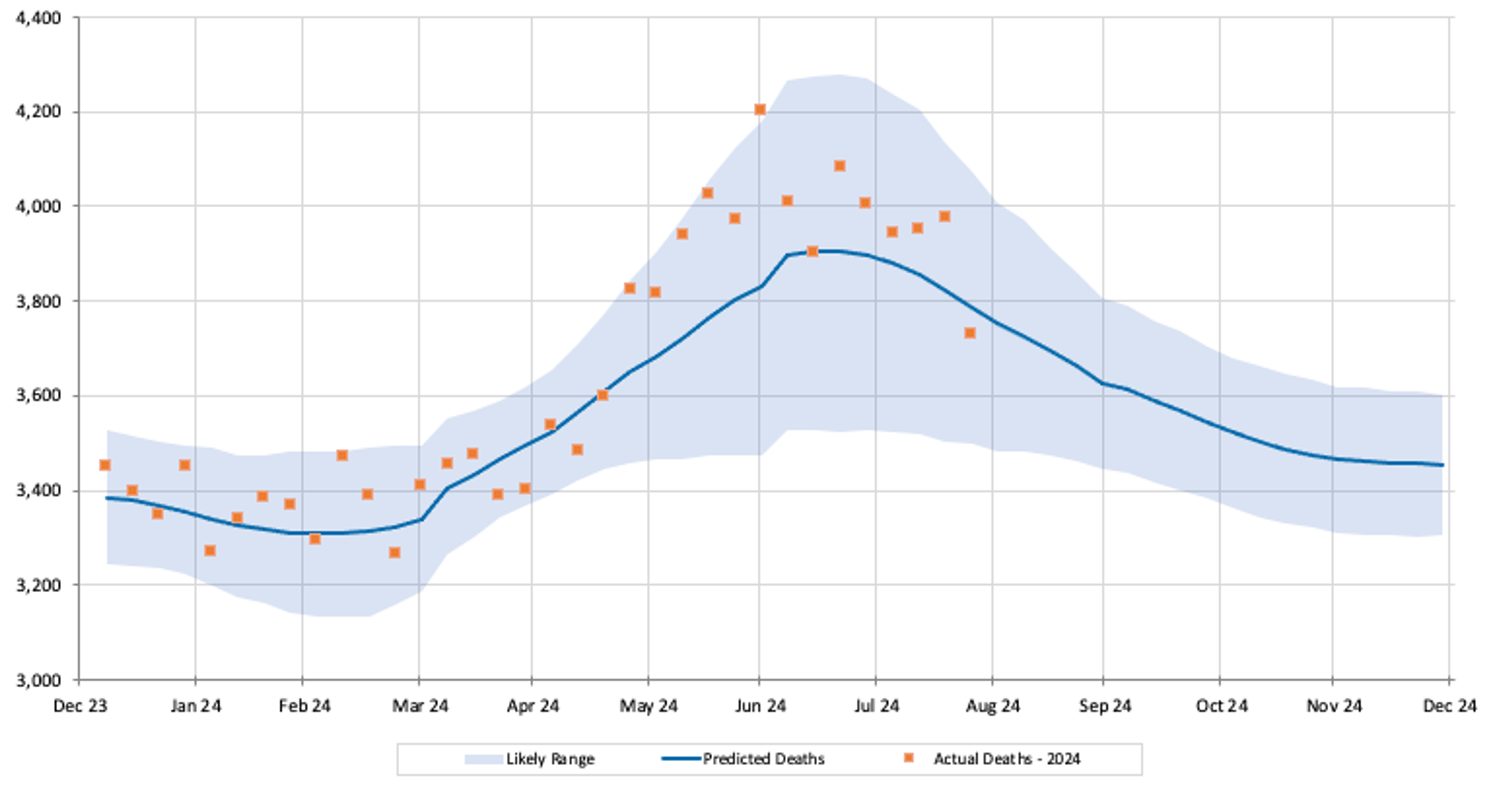 Proyectamos que la mortalidad para 2024 incluirá dos olas de Covid-19, ambas más bajas que en 2023, y que el resto de la mortalidad será una mejora con respecto a 2023. En el año hasta agosto de 2024, en lugar de niveles de mortalidad más bajos que en 2023, Covid-19 ha provocado aproximadamente el mismo nivel de muertes que en 2023 en conjunto, y la ola de invierno ha sido significativamente peor que lo proyectado, ha durado más y ha alcanzado niveles máximos de muertes más altos que los previstos. Otras muertes por enfermedades respiratorias también han sido peores de lo esperado, y el resto de la mortalidad ha estado en línea con las predicciones hasta la fecha. La COVID-19 sigue siendo una nueva fuente importante de mortalidad en la población australiana, sin indicios de que esté sustituyendo a las muertes por otras causas, lo que ha llevado a que la mortalidad total sea un 2%, o más de 2000 muertes más de lo previsto en los ocho meses hasta agosto de 2024. Exceso de muertes hasta el 31 de agosto de 2024 Medimos el exceso de muertes comparando las muertes reales cada semana con una línea de base. Para 2024, esta línea de base son nuestros valores previstos, basados en la mortalidad de 2023 y las tasas de mejora esperadas, e incluyendo la COVID-19. Esto es diferente de nuestras líneas de base para años anteriores, que se basaron en la ausencia de una pandemia. Tenga en cuenta que nuestra asignación para la COVID-19 es necesariamente una estimación mucho más aproximada que otras posibles causas de muerte, debido a los datos limitados a partir de los cuales estimar tanto el momento como la gravedad de las olas de COVID-19.