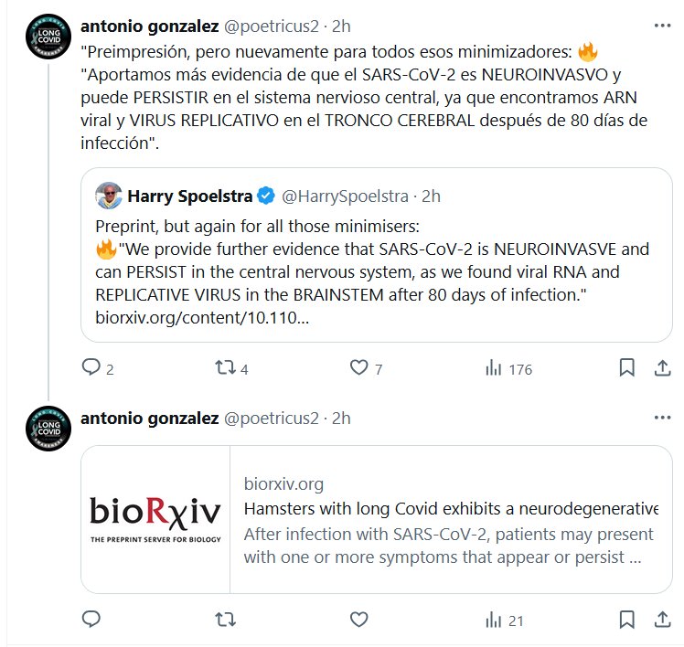 «Preimpresión, pero nuevamente para todos esos minimizadores: 🔥»Aportamos más evidencia de que el SARS-CoV-2 es NEUROINVASVO y puede PERSISTIR en el sistema nervioso central, ya que encontramos ARN viral y VIRUS REPLICATIVO en el TRONCO CEREBRAL después de 80 días de infección»