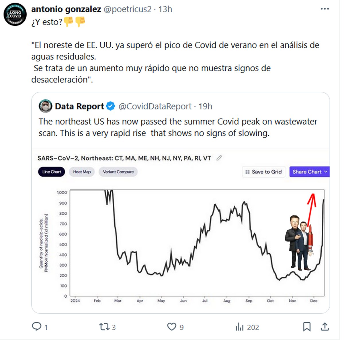 Antonio González @poetricus2 · ¿Y esto?👎👎 «El noreste de EE. UU. ya superó el pico de Covid de verano en el análisis de aguas residuales. Se trata de un aumento muy rápido que no muestra signos de desaceleración»
