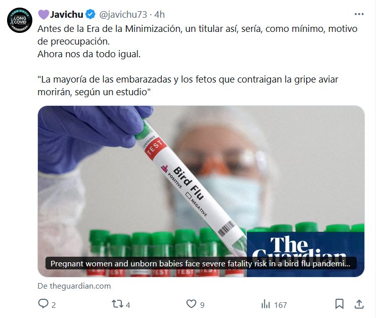 PARAPANDEMIA-SS 💜Javichu @javichu73 · Antes de la Era de la Minimización, un titular así, sería, como mínimo, motivo de preocupación. Ahora nos da todo igual. «La mayoría de las embarazadas y los fetos que contraigan la gripe aviar morirán, según un estudio»
