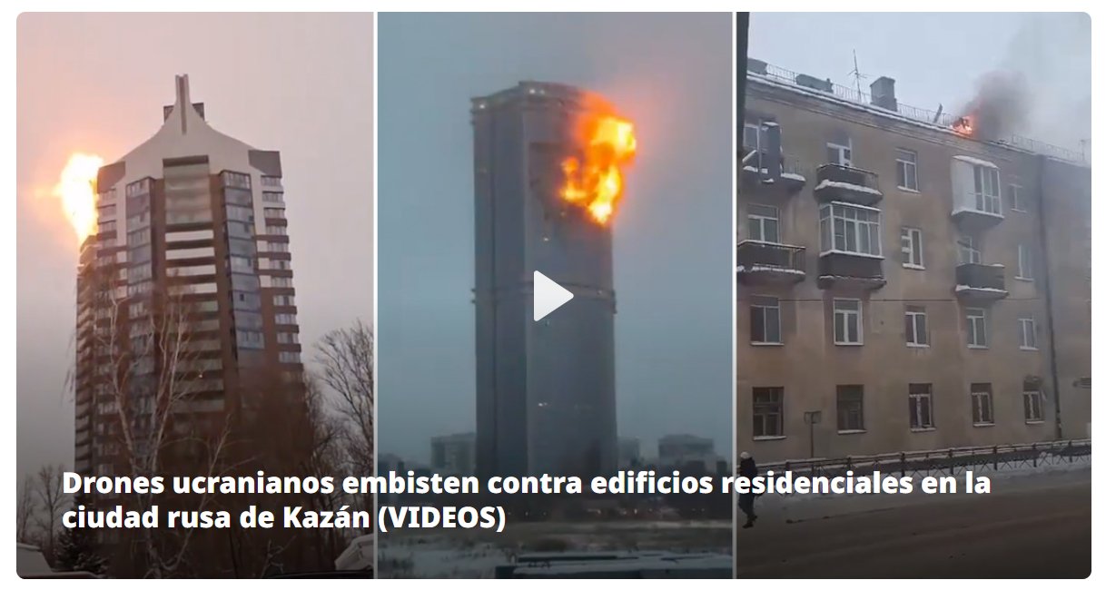 PESTE FINAL: 3º GUERRA MUNDIAL Drones ucranianos embisten contra edificios residenciales en la ciudad rusa de Kazán Posted on diciembre 21, 2024 por coronado "Après moi, le déluge" DICE EL NARCOPUTERÍO. NI MODO, IGUAL ÍBAMOS A MORIR TODOS https://actualidad.rt.com/actualidad/534627-ataque-drones-kazan