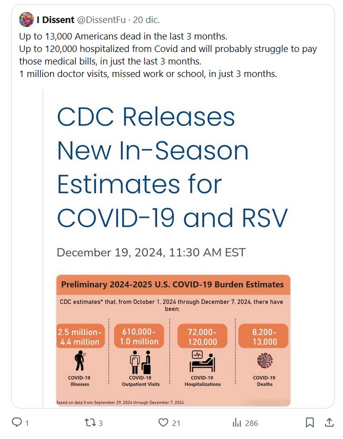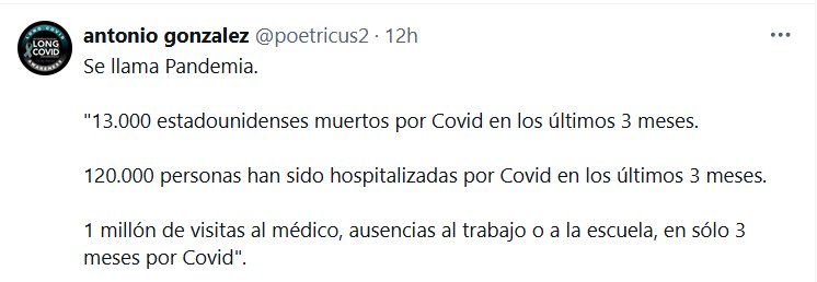 Se llama Pandemia. «13.000 estadounidenses muertos por Covid en los últimos 3 meses. 120.000 personas han sido hospitalizadas por Covid en los últimos 3 meses. 1 millón de visitas al médico, ausencias al trabajo o a la escuela, en sólo 3 meses por Covid»