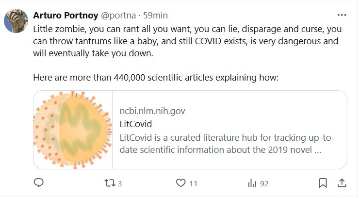 EN INGLES Arturo Portnoy @portna Pequeño zombie, puedes despotricar todo lo que quieras, puedes mentir, menospreciar y maldecir, puedes hacer berrinches como un bebé, y aún así el COVID existe, es muy peligroso y eventualmente te acabará. Aquí hay más de 440.000 artículos científicos que explican cómo ESTO: