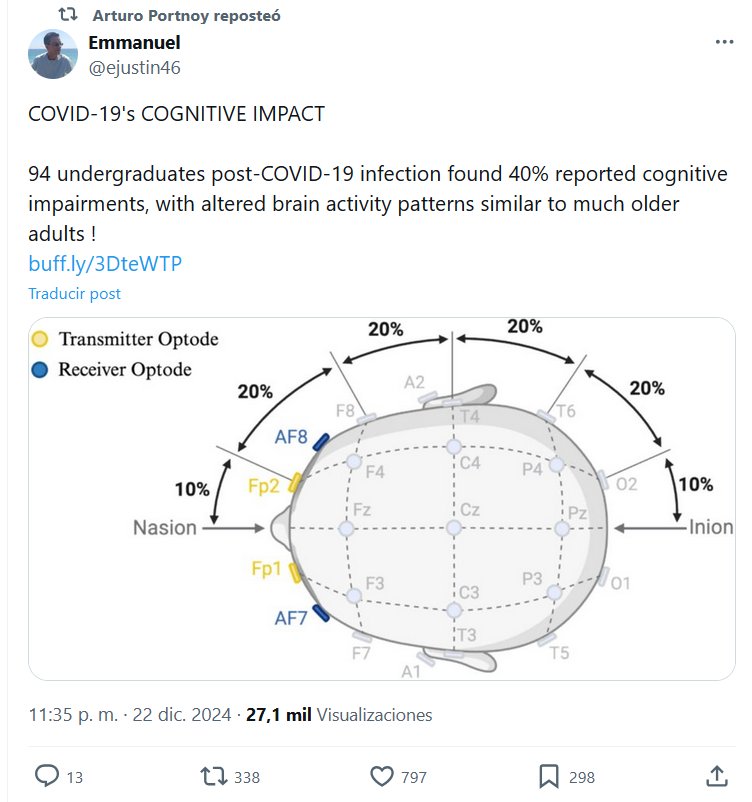 NUNCA FUE LEVE (EN INGLÉS) EL IMPACTO COGNITIVO DEL COVID-19 Se encontró que entre 94 estudiantes universitarios que contrajeron la infección por COVID-19, el 40 % informó deterioro cognitivo y patrones de actividad cerebral alterados similares a los de adultos mucho mayores!