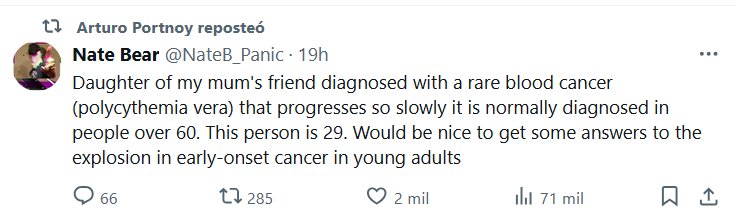 POSTCOVID HACE ESTRAGOS: COVID≠GRIPE -> COVID≈SIDA (EN INGLÉS) Nate Bear @NateB_Panic La hija de una amiga de mi madre fue diagnosticada con un cáncer de sangre poco común (policitemia vera) que progresa tan lentamente que normalmente se diagnostica en personas mayores de 60 años. Esta persona tiene 29 años. Sería bueno obtener algunas respuestas sobre la explosión del cáncer de aparición temprana en adultos jóvenes.