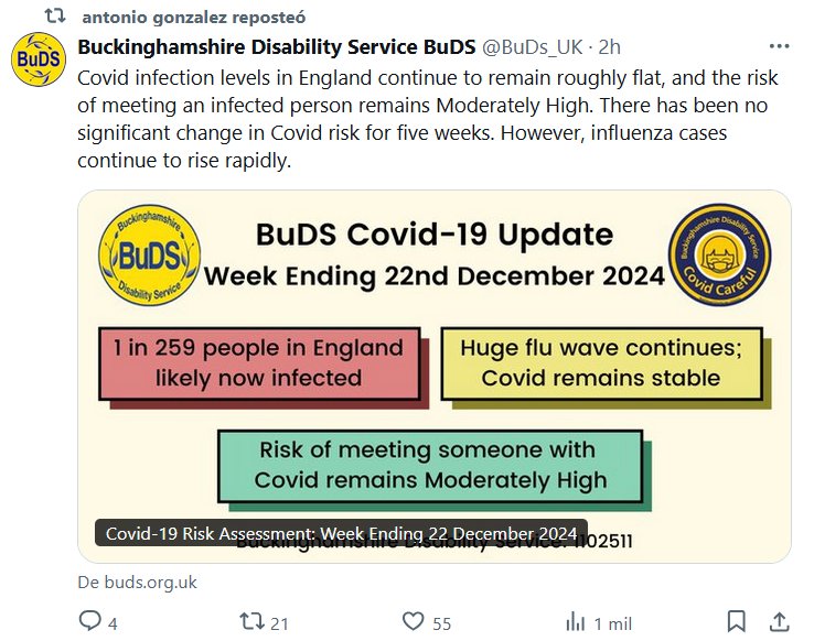 Servicio de Discapacidad de Buckinghamshire BuDS @BuDs_UK (EN INGLÉS) Los niveles de infección por COVID en Inglaterra siguen siendo más o menos estables y el riesgo de encontrarse con una persona infectada sigue siendo moderadamente alto. No ha habido cambios significativos en el riesgo de COVID durante cinco semanas. Sin embargo, los casos de gripe siguen aumentando rápidamente