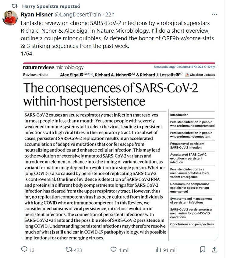 EN INGLÉS Harry Spoelstra reposteó Ryan Hisner @LongDesertTrain Fantástica reseña sobre infecciones crónicas por SARS-CoV-2 a cargo de las superestrellas virológicas Richard Neher y Alex Sigal en Nature Microbiology. Haré una breve descripción general, señalaré un par de pequeñas objeciones y defenderé el honor de ORF9b con algunas estadísticas y 3 secuencias sorprendentes de la semana pasada.