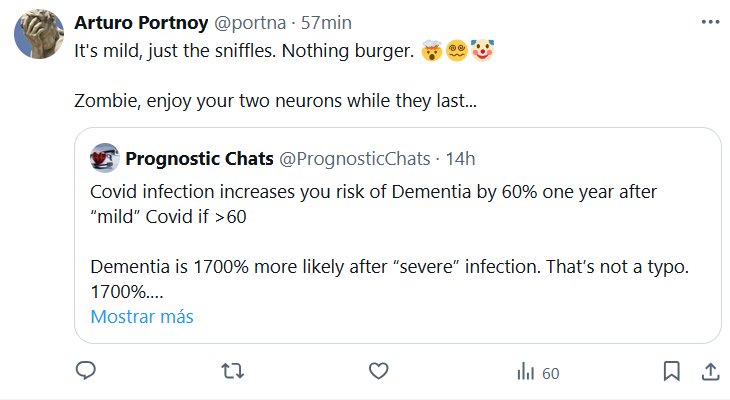 EN INGLÉS La infección por Covid aumenta el riesgo de demencia en un 60 % un año después de una infección «leve» por Covid si tiene más de 60 años La probabilidad de padecer demencia es un 1700 % mayor después de una infección «grave». No es un error tipográfico. 1700 %. El deterioro cognitivo es el DOBLE de probabilidad después de CUALQUIER infección por Covid. The Lancet, febrero de 2024