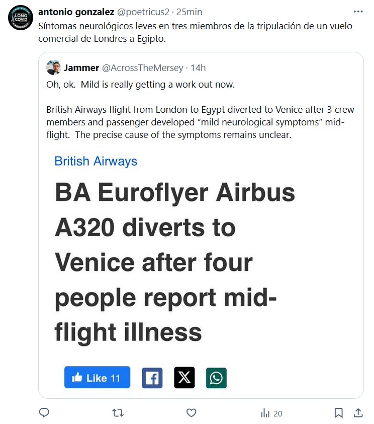 Ah, vale. "Mild" está haciendo un gran ejercicio ahora. Un vuelo de British Airways de Londres a Egipto fue desviado a Venecia después de que tres miembros de la tripulación y un pasajero presentaran “síntomas neurológicos leves” en pleno vuelo. La causa exacta de los síntomas sigue sin estar clara.