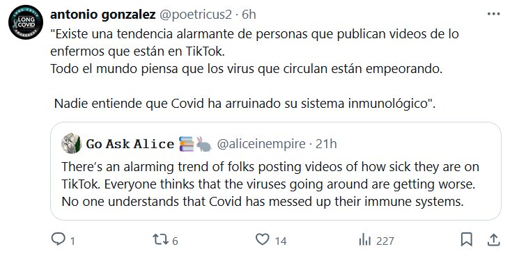 «Existe una tendencia alarmante de personas que publican videos de lo enfermos que están en TikTok. Todo el mundo piensa que los virus que circulan están empeorando. Nadie entiende que Covid ha arruinado su sistema inmunológico».