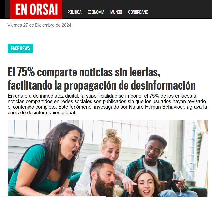 PESTE FAKE NEWS El 75% comparte noticias sin leerlas, facilitando la propagación de desinformación Posted on diciembre 27, 2024 por coronado https://www.enorsai.com.ar/sociedad/42289-el-75-comparte-noticias-sin-leerlas--facilitando-la-propagacion-de-desinformacion.html