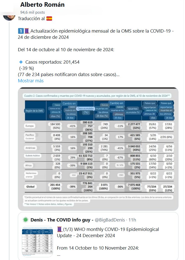 Y LOS DATOS REALES? POR CUÁNTO HAY QUE MULTIPLICAR? Traducción al 🇪🇦 1️⃣🧵Actualización epidemiológica mensual de la OMS sobre la COVID-19 – 24 de diciembre de 2024 Del 14 de octubre al 10 de noviembre de 2024: 🔹 Casos reportados: 201,454