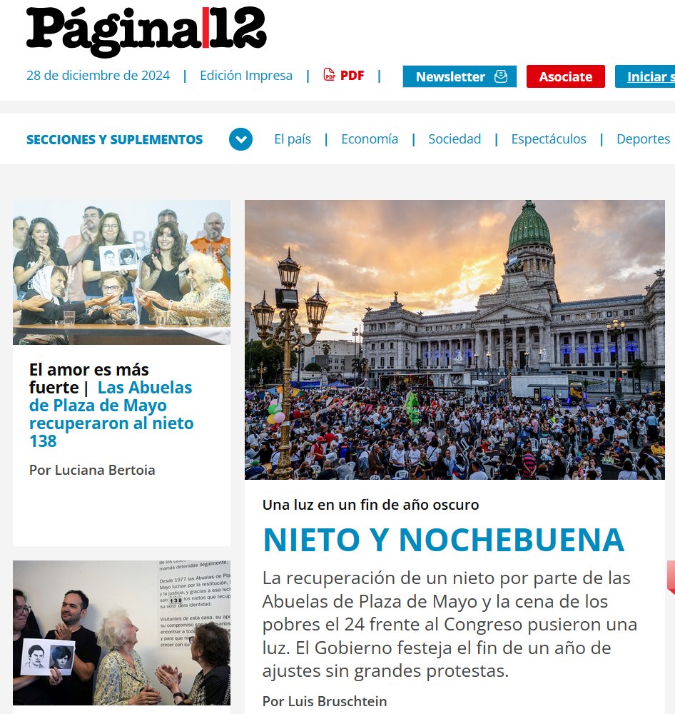 COVID NO FUE EL 1º ASESINO El amor es más fuerte Las Abuelas de Plaza de Mayo recuperaron al nieto 138 Por Luciana Bertoia Posted on diciembre 28, 2024 por coronado https://www.pagina12.com.ar/793362-las-abuelas-encontraron-al-nieto-138-la-verdad-siempre-sale-