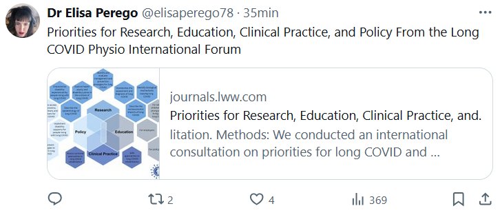 EN INGLÉS Dra. Elisa Perego @elisaperego78 Prioridades para la investigación, la educación, la práctica clínica y las políticas del Foro Internacional de Fisioterapia para COVID Prolongado Posted on diciembre 30, 2024 por coronado https://journals.lww.com/cptj/fulltext/9900/priorities_for_research,_education,_clinical.57.aspx