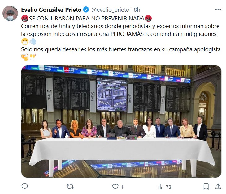 EL 4º PODER ES EL PODER DEL DIABLO Evelio González Prieto @evelio_prieto · 8h 🤬SE CONJURARON PARA NO PREVENIR NADA🤬 Corren ríos de tinta y telediarios donde periodistas y expertos informan sobre la explosión infecciosa respiratoria PERO JAMÁS recomendarán mitigaciones😷💨 Solo nos queda desearles los más fuertes trancazos en su campaña apologista🍻🥂