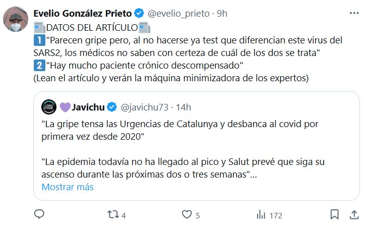Evelio González Prieto @evelio_prieto · 9h 📰DATOS DEL ARTÍCULO📰 1⃣»Parecen gripe pero, al no hacerse ya test que diferencian este virus del SARS2, los médicos no saben con certeza de cuál de los dos se trata» 2⃣»Hay mucho paciente crónico descompensado» (Lean el artículo y verán la máquina minimizadora de los expertos)