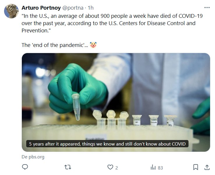 LA MENTIRA DEL «FIN DE PANDEMIA» EN INGLÉS «En los Estados Unidos, un promedio de unas 900 personas por semana han muerto de COVID-19 durante el último año, según los Centros para el Control y la Prevención de Enfermedades de Estados Unidos». El ‘fin de la pandemia’… 🤡
