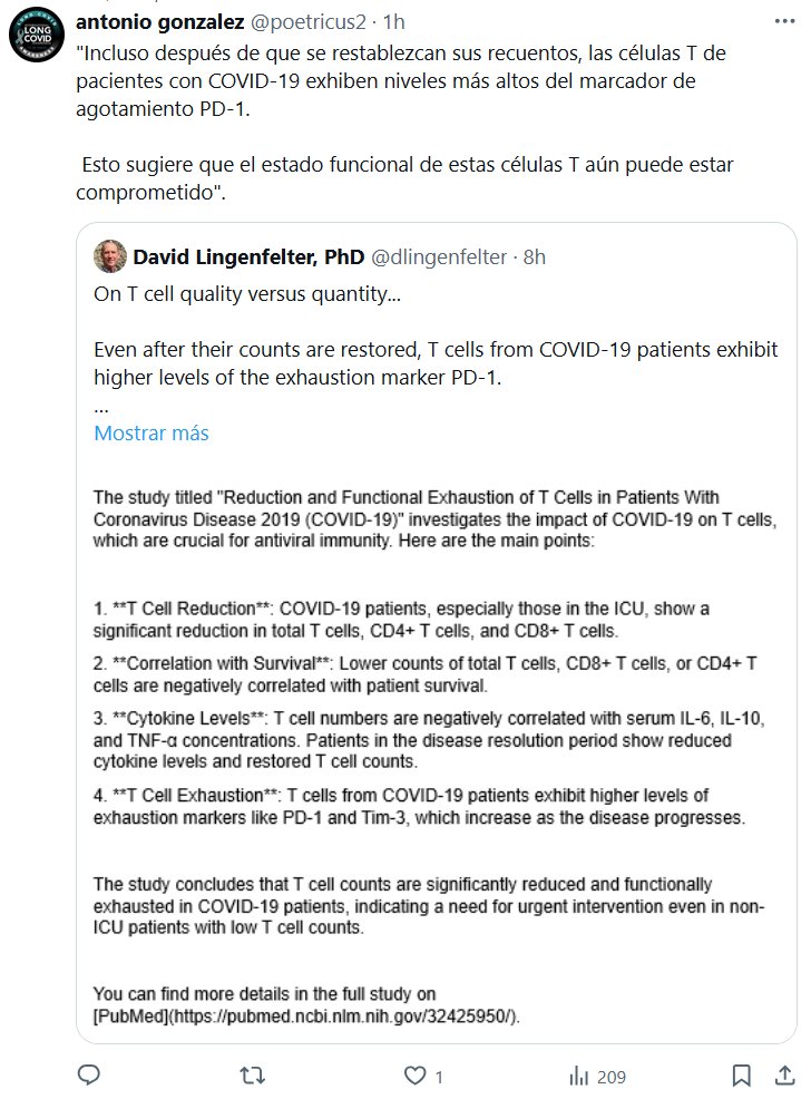 Y ESTO EXPLICA TODAS LAS ENFERMEDADES POSTCOVID «Incluso después de que se restablezcan sus recuentos, las células T de pacientes con COVID-19 exhiben niveles más altos del marcador de agotamiento PD-1. Esto sugiere que el estado funcional de estas células T aún puede estar comprometido»