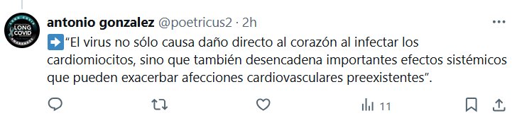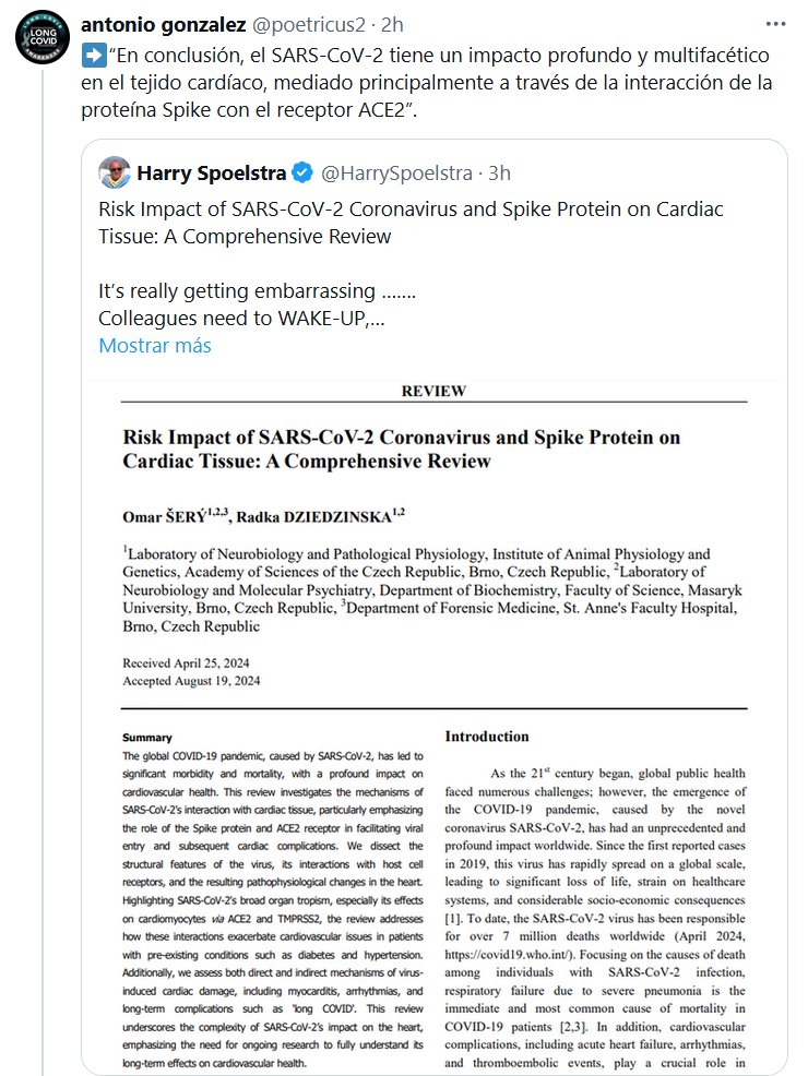 Antonio González @poetricus2 · ➡️“En conclusión, el SARS-CoV-2 tiene un impacto profundo y multifacético en el tejido cardíaco, mediado principalmente a través de la interacción de la proteína Spike con el receptor ACE2”