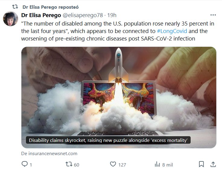 Dra. Elisa Perego @elisaperego78 «El número de discapacitados entre la población estadounidense aumentó casi un 35 por ciento en los últimos cuatro años», lo que parece estar relacionado con #LongCovid y el empeoramiento de enfermedades crónicas preexistentes después de la infección por SARS-CoV-2