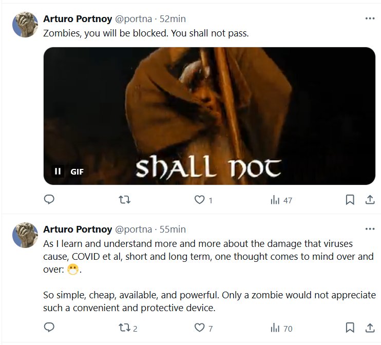 EN INGLÉS Arturo Portnoy @portna · A medida que aprendo y entiendo más sobre el daño que causan los virus, COVID y demás, a corto y largo plazo, un pensamiento me viene a la mente una y otra vez: 😷 [MASCARILLA]. Tan simple, barato, disponible y poderoso. Solo un zombi no apreciaría un dispositivo tan conveniente y protector