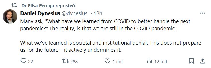 ESCUCHO VOCES QUE SON GRITOS (EN INGLÉS) La Dra. Elisa Perego reposteó Daniel Dynesius @dynesius_ Muchos se preguntan: «¿Qué hemos aprendido de la COVID para manejar mejor la próxima pandemia?» La realidad es que todavía estamos en la pandemia de COVID. Lo que hemos aprendido es la negación social e institucional. Esto no nos prepara para el futuro, sino que lo socava activamente.