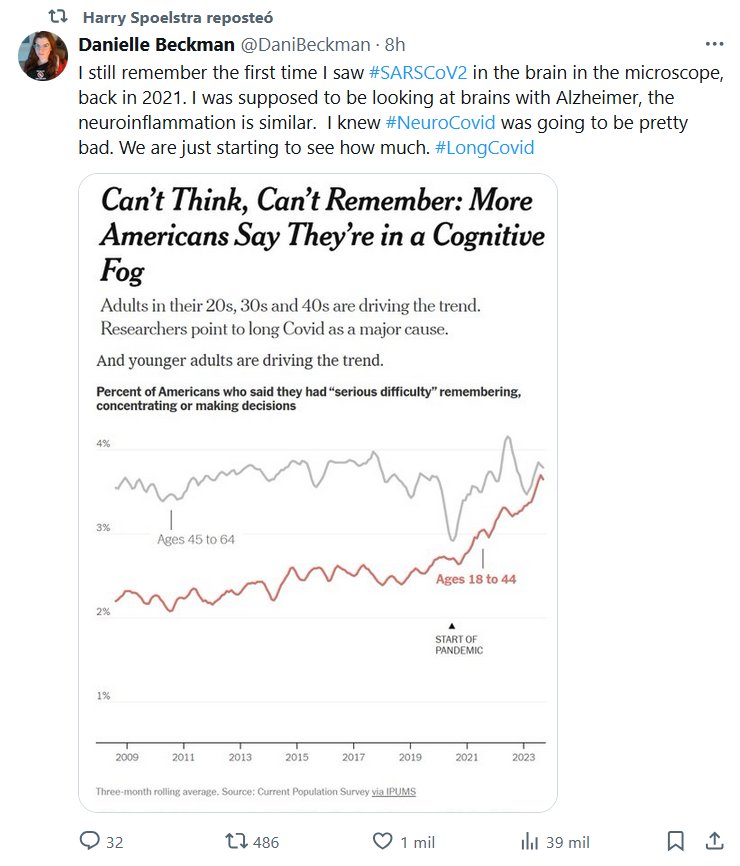 EN INGLÉS Harry Spoelstra reposteó Danielle Beckman @DaniBeckman Todavía recuerdo la primera vez que vi #SARSCoV2 en el cerebro con el microscopio, allá por 2021. Se suponía que debía estar observando cerebros con Alzheimer, la neuroinflamación es similar. Sabía que #NeuroCovid iba a ser bastante malo. Apenas estamos empezando a ver cuánto. #LongCovid