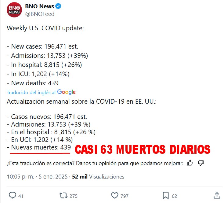 FIN DE PANDEMIA? 1º SEMANA DE 2025 (EN INGLÉS) Actualización semanal sobre la COVID-19 en EE. UU.: – Casos nuevos: 196,471 est. – Admisiones: 13.753 (+39 %) – En el hospital : 8 ,815 (+26 %) – En UCI: 1.202 (+14 %) – Nuevas muertes: 439