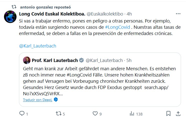 Long Covid Euskal Kolektiboa. @Euskalkolektibo · 4h Si vas a trabajar enfermo, pones en peligro a otras personas. Por ejemplo, todavía están surgiendo nuevos casos de #LongCovid . Nuestras altas tasas de enfermedad, se deben a fallas en la prevención de enfermedades crónicas
