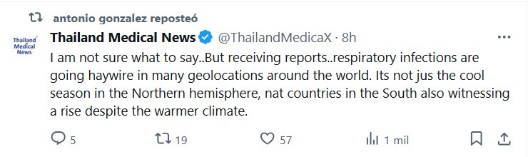 Y TE PUEDO ASEGURAR QUE NO HACE FRÍO EN BOLIVIA! EN INGLÉS antonio gonzalez reposteó Noticias médicas de Tailandia @ThailandMedicaX No estoy seguro de qué decir… pero los informes que recibo indican que las infecciones respiratorias están descontrolándose en muchas ubicaciones geográficas del mundo. No se trata solo de la temporada fría en el hemisferio norte, los países del sur también están experimentando un aumento a pesar del clima más cálido.