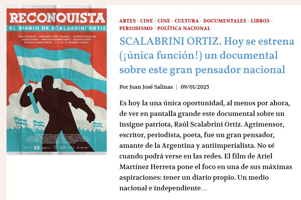 ES VIRAL: SCALABRINI ORTIZ. Hoy se estrena (¡única función!) un documental sobre este gran pensador nacional Posted on enero 10, 2025 por coronado https://pajarorojo.com.ar/scalabrini-ortiz-hoy-se-estrena-unica-funcion-un-documental-sobre-este-gran-pensador-nacional/