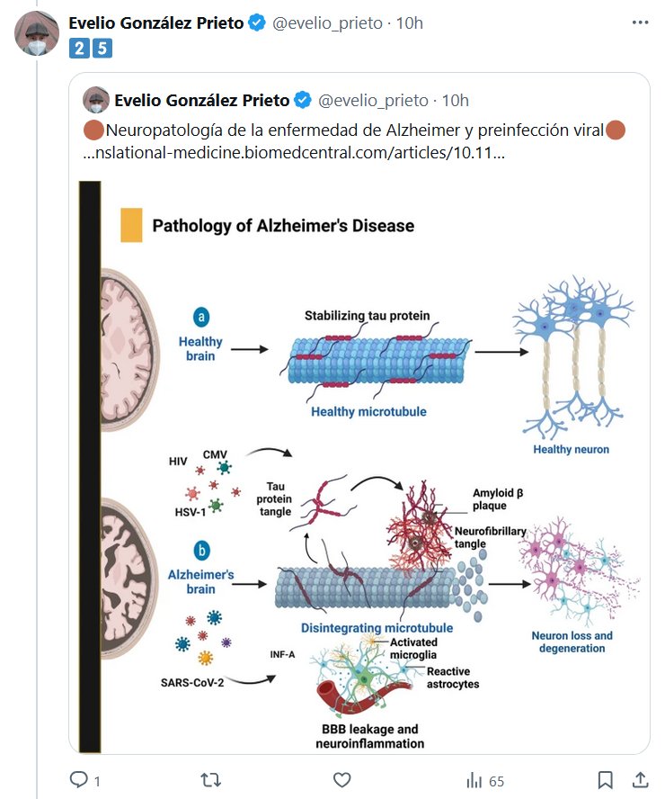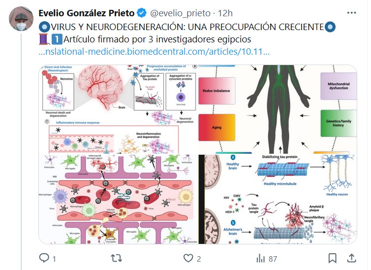 DR Evelio González Prieto @evelio_prieto · 11h 🔘VIRUS Y NEURODEGENERACIÓN: UNA PREOCUPACIÓN CRECIENTE🔘 🧵1⃣Artículo firmado por 3 investigadores egipcios Posted on enero 15, 2025 por coronado https://translational-medicine.biomedcentral.com/articles/10.1186/s12967-024-06025-6