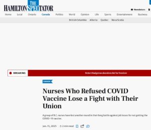 EN INGLÉS Enfermeras que rechazaron la vacuna contra el COVID-19 pierden una pelea con su sindicato Posted on enero 15, 2025 por coronado https://www.thespec.com/news/canada/nurses-who-refused-covid-vaccine-lose-a-fight-with-their-union/article_ec236344-811d-5436-b193-49a4c27383d4.html