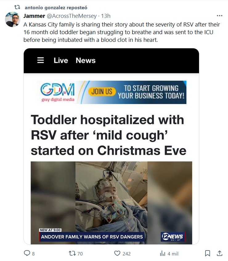 LE MIENTEN A LA GENTE: VSR NO PRODUCE COÁGULOS, COVID SÍ (EN INGLÉS) Jammer @AcrossTheMersey Una familia de Kansas City comparte su historia sobre la gravedad del VSR después de que su hijo de 16 meses comenzó a tener dificultades para respirar y fue enviado a la UCI antes de ser intubado con un coágulo de sangre en el corazón