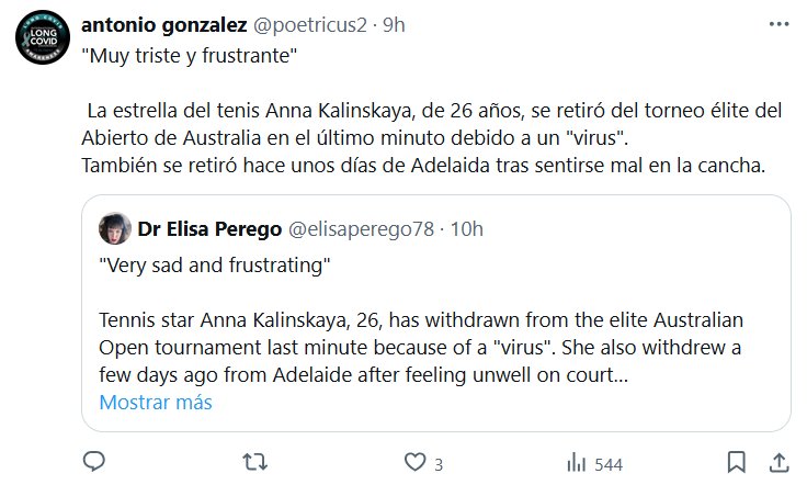 NODIGAMOSCOVID HACE ESTRAGOS «Muy triste y frustrante» La estrella del tenis Anna Kalinskaya, de 26 años, se retiró del torneo élite del Abierto de Australia en el último minuto debido a un «virus». También se retiró hace unos días de Adelaida tras sentirse mal en la cancha.
