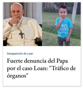 PESTE CAPITALISMO APOCALÍPTICO Fuerte denuncia del Papa por el caso Loan: «Tráfico de órganos» Posted on enero 15, 2025 por coronado https://www.eldestapeweb.com/sociedad/desaparicion-de-loan/fuerte-denuncia-del-papa-por-el-caso-loan-trafico-de-organos--202511591638