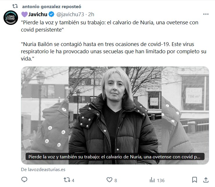 «Pierde la voz y también su trabajo: el calvario de Nuria, una ovetense con covid persistente» «Nuria Bailón se contagió hasta en tres ocasiones de covid-19. Este virus respiratorio le ha provocado unas secuelas que han limitado por completo su vida.»
