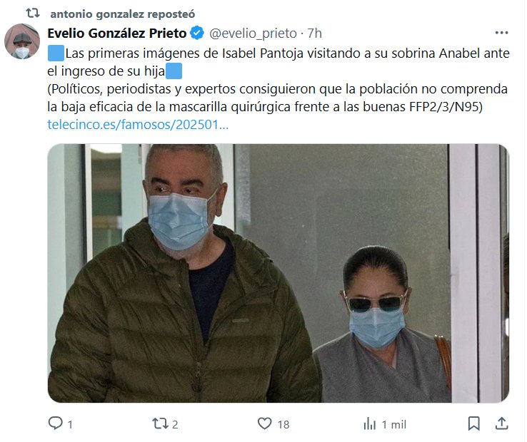 antonio gonzalez reposteó Evelio González Prieto @evelio_prieto · 7h 🟦Las primeras imágenes de Isabel Pantoja visitando a su sobrina Anabel ante el ingreso de su hija🟦 (Políticos, periodistas y expertos consiguieron que la población no comprenda la baja eficacia de la mascarilla quirúrgica frente a las buenas FFP2/3/N95)