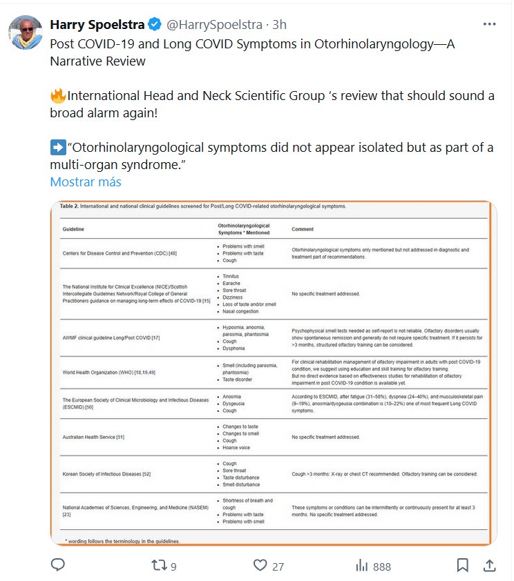 EN INGLÉS Síntomas pos-COVID-19 y de COVID prolongado en otorrinolaringología: una revisión narrativa ¡La revisión del International Head and Neck Scientific Group debería volver a hacer sonar la alarma!