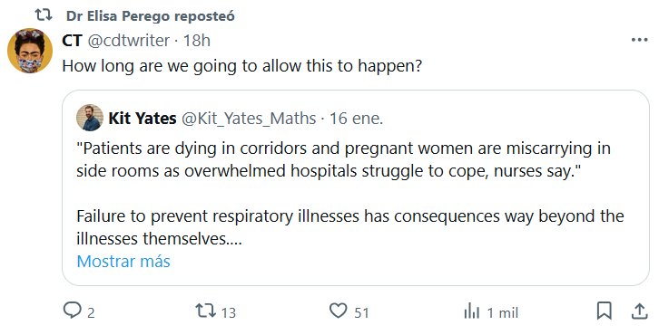 EN INGLÉS La Dra. Elisa Perego reposteó CT @cdtwriter · 18h ¿Cuánto tiempo vamos a permitir que esto suceda? Cita Kit Yates @Kit_Yates_Maths · 16 ene. «Los pacientes están muriendo en los pasillos y las mujeres embarazadas están abortando en las habitaciones laterales mientras los hospitales desbordados luchan por hacer frente a la situación, dicen las enfermeras»