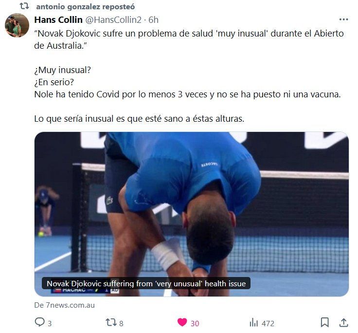 POBRES COVIDIOTAS! Hans Collin @HansCollin2 · 6h “Novak Djokovic sufre un problema de salud ‘muy inusual’ durante el Abierto de Australia.” ¿Muy inusual? ¿En serio? Nole ha tenido Covid por lo menos 3 veces y no se ha puesto ni una vacuna. Lo que sería inusual es que esté sano a éstas alturas.