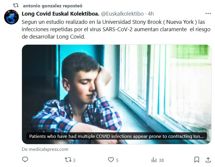Long Covid Euskal Kolektiboa. @Euskalkolektibo · 4h Segun un estudio realizado en la Universidad Stony Brook ( Nueva York ) las infecciones repetidas por el virus SARS-CoV-2 aumentan claramente el riesgo de desarrollar Long Covid