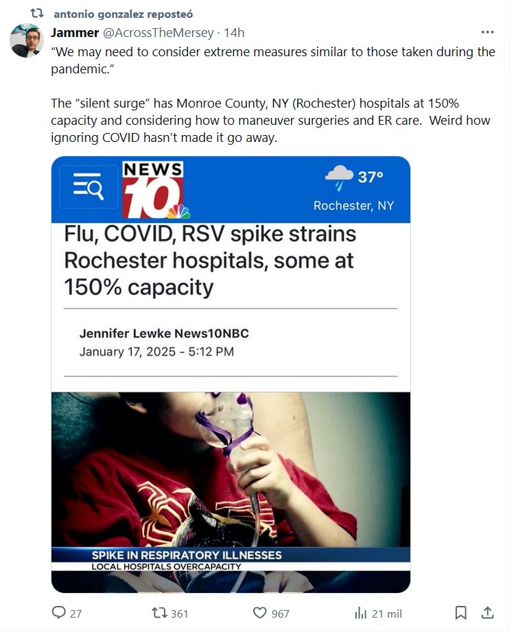 ESCUCHO VOCES (EN INGLÉS) “Es posible que debamos considerar medidas extremas similares a las que se tomaron durante la pandemia”. El “aumento silencioso” tiene a los hospitales del condado de Monroe, NY (Rochester) al 150% de su capacidad y considerando cómo manejar las cirugías y la atención en urgencias. Es extraño que ignorar el COVID no haya hecho que desaparezca