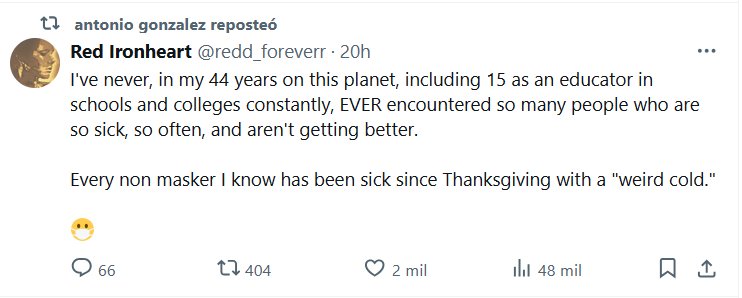 TESTIMONIOS (EN INGLÉS) antonio gonzalez reposteó Red Ironheart @redd_foreverr Nunca, en mis 44 años en este planeta, incluidos 15 como educador en escuelas y universidades constantemente, me he encontrado con tantas personas que están tan enfermas, tan a menudo, y no mejoran. Todos los que no usan mascarillas que conozco han estado enfermos desde el Día de Acción de Gracias con un «resfriado raro».