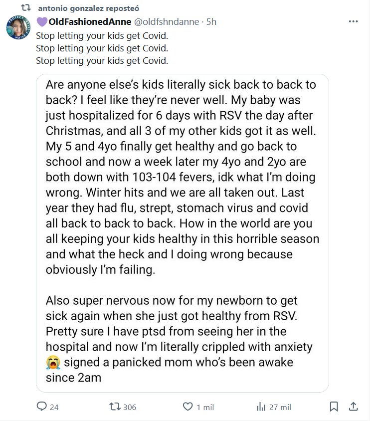 ¿Los hijos de alguien más están literalmente enfermos uno tras otro? Siento que nunca están bien. Mi bebé acaba de ser hospitalizada durante 6 días con VSR el día después de Navidad, y mis otros 3 hijos también lo contrajeron. Mi hijo de 5 y 4 años finalmente se recuperan y vuelven a la escuela y ahora, una semana después, mi hijo de 4 y mi hijo de 2 años están enfermos con fiebre de 103-104 (ºF), no sé qué estoy haciendo mal. Llega el invierno y nos sacan a todos. El año pasado tuvieron gripe, estreptococos, virus estomacales y covid, todo seguido. ¿Cómo diablos están todos manteniendo a sus hijos sanos en esta horrible temporada? ¿Qué diablos estoy haciendo mal? Porque obviamente estoy fallando. También estoy súper nerviosa ahora por si mi recién nacida se enferma de nuevo cuando acaba de recuperarse del VSR. Estoy bastante segura de que tengo trastorno de estrés postraumático por verla en el hospital y ahora estoy literalmente paralizada por la ansiedad "•", firmó una madre en pánico que ha estado despierta desde las 2 a. m.