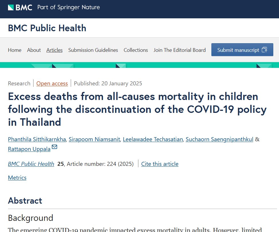 LESA HUMANIDAD (EN INGLÉS) Exceso de muertes por todas las causas en niños tras la interrupción de la política de COVID-19 en Tailandia Posted on enero 20, 2025 por coronado https://bmcpublichealth.biomedcentral.com/articles/10.1186/s12889-025-21484-2